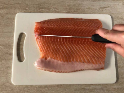 A questo punto prendete il vostro filetto di salmone, meglio se già spellato dal pescivendolo, assicuratevi che sia privo di lische e poi iniziate a lavorarlo. Dovrete prima dividerlo in due parti nel senso della lunghezza, utilizzerete poi la parte superiore più adatta a questa preparazione. Fatta questa operazione, non vi resta che tagliarlo a fettine.