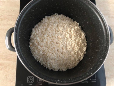 Versate il riso in una pentola, copritelo con l’acqua fredda, mettete il coperchio e iniziate la cottura a fiamma alta, quando arriverà al bollore, abbassate la fiamma al minimo, proseguite la cottura per 12 minuti circa, a fine cottura il riso avrà assorbito tutta l’acqua, lasciatelo riposare una decina di minuti.