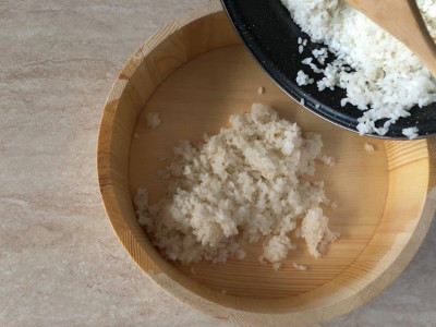 Bagnate l’angiri (ciotola di legno giapponese) poi sistemate il riso al suo interno, versate lo sciroppo preparato e mescolatelo con un mestolo di legno senza schiacciarlo, quindi copritelo con un panno da cucina umido.