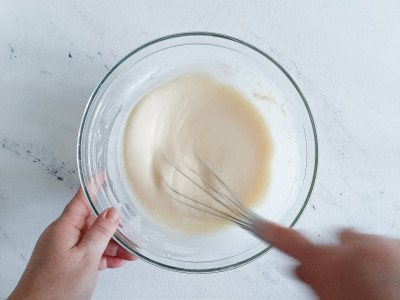 Mescolare con una frusta fino ad ottenere una pastella liscia, cremosa e senza grumi.