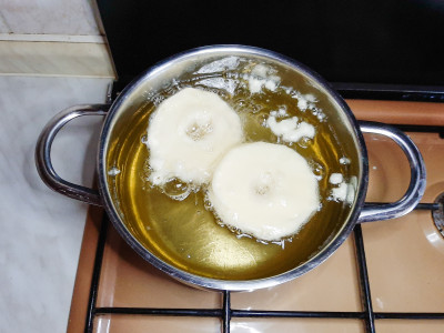 Appena l'olio raggiunge la temperatura (immergere la punta di uno stecchino e verificare se frigge), passare velocemente ogni fetta di mela nella pastella e poi tuffarle nell’olio, massimo due pezzi alla volta.