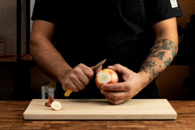 Per preparare gli anelli di cipolla fritti, per prima cosa, pela la cipolla. Tagliala a fette di circa 1 cm di spessore e dividi gli anelli. puoi tenerne qualcuno singolo e qualcuno doppio.