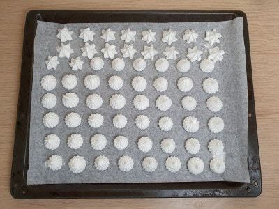 Rivestite una teglia con un foglio di carta forno e iniziate a spremere le meringhe, della dimensione di circa 2 cm.