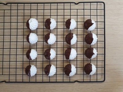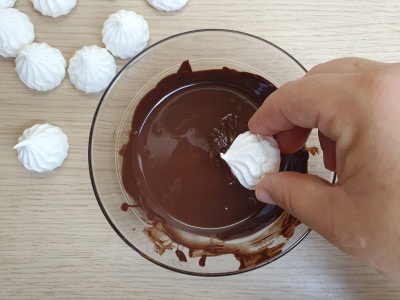 Prelevate una meringa, una alla volta, e intingetela per metà nel cioccolato fuso. Lasciate asciugare su una gratella.