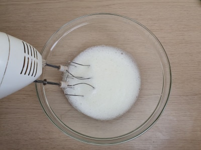 Appena gli albumi iniziano a montare e a schiumare, unite lo zucchero, 1 cucchiaio alla volta, sempre frullando.