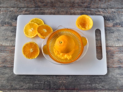 Grattugiate la buccia delle arance e spremetele per ricavare 200 ml di succo di arancia. Tenete da parte sia il succo che la scorza.
