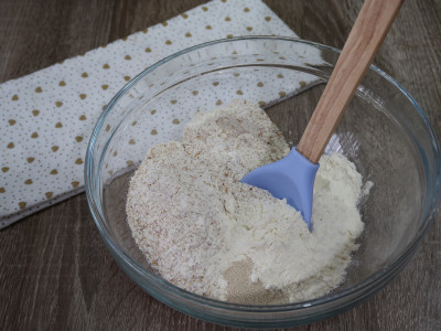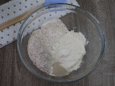 Per preparrae il pane veloce integrale all’interno di una ciotola versate la farina integrale, la farina 00 e il lievito di birra secco.