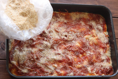 Spolverate tutta la superficie con il pangrattato. Dopo aggiungete il pecorino grattugiato. Distribuite sul pangrattato, l’origano. In ultimo, irrorate tutta la superficie con un filo di olio di Oliva. Infornate il vostro sfincione palermitano a 220° C in modalità statica nel ripiano centrale. Dopo 15 minuti controllate che la base sia dorata e che sulla superficie si sia creata una succulenta crosticina croccante. Servite il vostro sfincione palermitano morbido ben caldo.
