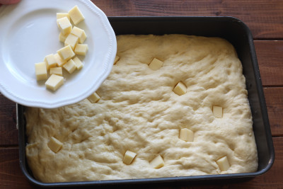 Trascorse le due ore tagliate a dadini il caciocavallo. Affondate ogni pezzettino nell’impasto dello sfincione. Procedete allo stesso modo con pezzetti di acciughe. Aggiungete il sugo di cipolle, distribuendo con una forchetta le cipolle su tutto lo sfincione.