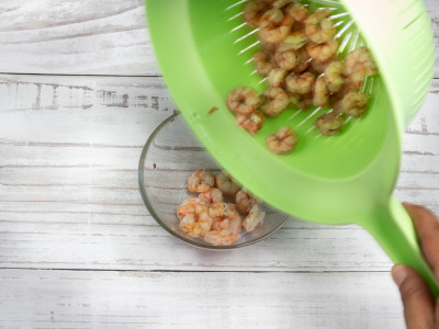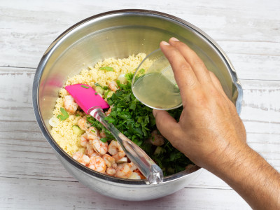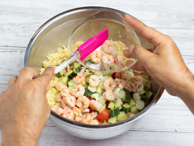 Per preparare il cous cous con gamberetti e rapa rossa, portate ad ebollizione l’acqua con un pizzico di sale in una pentola. versate il cous cous precotto, spegnete il fuoco e coprite con il coperchio lasciate riposare 15 minuti. Nel frattempo portate a bollore in un’altra pentola l’acqua e versate i gamberetti.