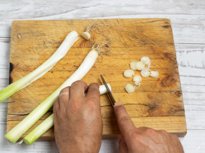 Tagliate a rondelle i cipollotti, tagliate a cubetti il cetriolo, tritate un mazzetto di prezzemolo ed anche un ciuffo di menta.
