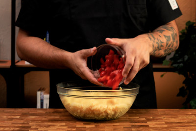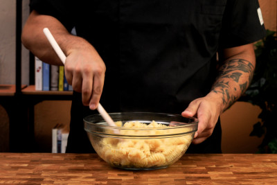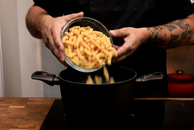 Per preparare l'insalata di pasta mediterranea versa la pasta in acqua bollente e salata. Portala a cottura, e poi scolala con un colapasta.