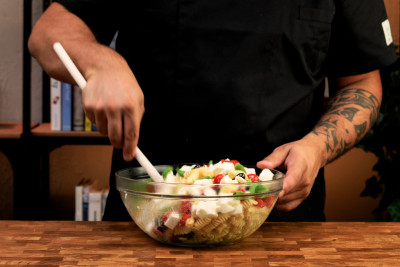 Mescola e quando l'insalata di pasta alla mediterranea è ben mischiata, impiatta.