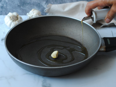 Mettete uno spicchio d’aglio e un filo d’olio in una padella e fatelo rosolare finchè comicia a sfrigolare.