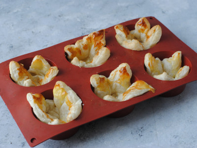 Inserite i quadrati di sfoglia all’interno di uno stampo porta muffin, oppure semplicemente in dei pirottini di carta.