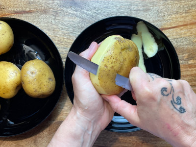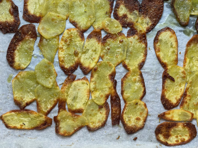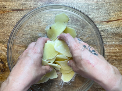 Pela e lava le patate. Non usare quelle farinose, ma quelle adatte ad essere cotte al forno. Con una mandolina o con un coltello taglia delle fettine sottili. Più saranno sottili più saranno croccanti dopo la cottura.