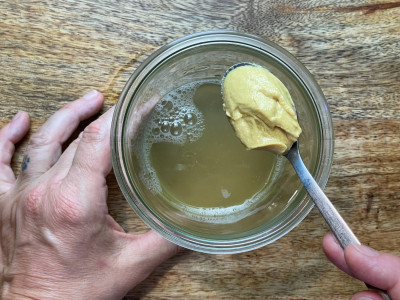 Prepara la maionese con aquafaba: in una ciotola mettine 100 g (la ottieni lessando 500 g di ceci secchi lasciati a mollo una notte con 1,2 l di acqua). Deve essere ben fredda. Aggiungi la senape e il sale.