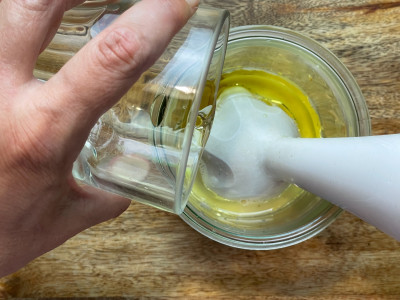 Versa a filo l’olio di semi,,, mentri frulli con il frullatore ad immersione, fino a quando non si sarà addensata. Unisci il succo di limone filtrato o l’aceto di mele e mescola.