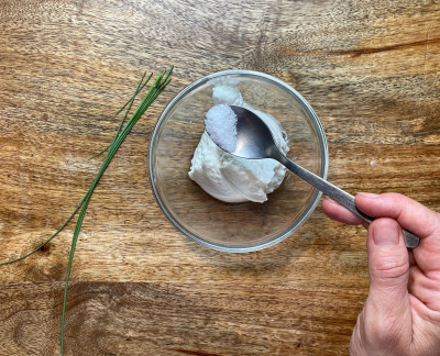 Nel frattempo prepara la salse partendo da quella allo yogurt: mettilo in una ciotolina e unisci il sale e l’olio. Taglia l'erba cipollina ben lavata e aggiungila allo yogurt. Mescola per bene.