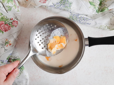 Versa il latte in una casseruola da 20 cm, aggiungi la scorza di un limone grande bio, avendo cura di non prendere anche la parte bianca che risulta amara.