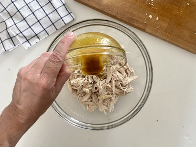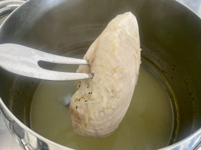 Estrai il petto di pollo dal brodo bollente, lascialo intiepidire per una decina di minuti e poi sfilaccialo con una forchetta.