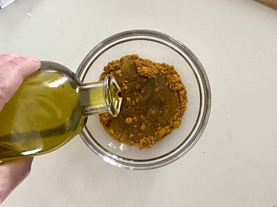 Sciogli il curry in una ciotolina con un po’ d’olio e aggiungi il succo di mezzo limone.