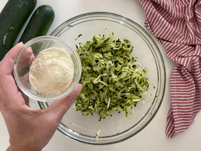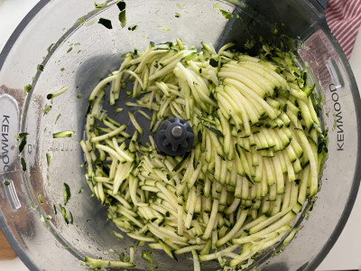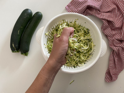 Per prima cosa, priva le zucchine delle estremità e tagliale a julienne con l’ausilio di una mandolina o un robot da cucina.