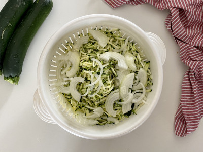 Metti le zucchine e le cipolle in uno scolapasta e cospargi di sale.