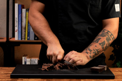 Per preparare la torta tenerina, trita il cioccolato grossolanamente per poterlo sciogliere agevolmente. Spostalo in una ciotola e scioglilo nel microonde 30 secondi alla volta