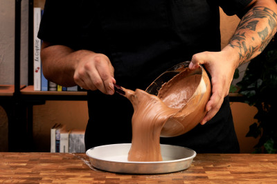 Continua a sciogliere il cioccolato 30 secondi alla volta, mescolandolo continuamente fino a che non è del tutto fluido. Aggiungi il burro e mescola ancora fino ad emulsionare tutto.