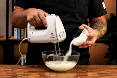 Con le stesse fruste, monta i tuorli con la parte restate di zucchero, aggiungendolo sempre piano piano.