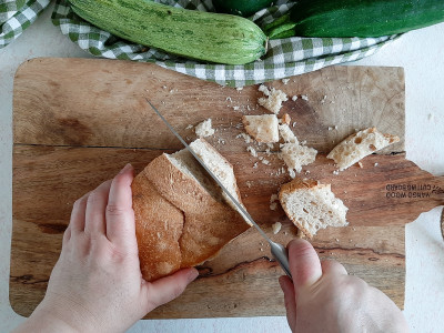 Taglia il pane raffermo a pezzi grossolani e mettilo in ammollo con acqua fredda in una ciotola per circa 20 minuti, o comunque fino a quando non sarà del tutto morbido.