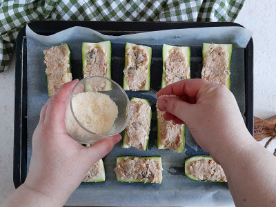 Sistema le barchette di zucchine sopra una leccarda foderata con carta forno, e farcisci l’interno di ognuna con un cucchiaino abbondante di impasto.