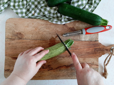 Nel mentre occupati delle zucchine: spunta le estremità, taglia in due e scava l’interno con un cucchiaino, mettendo la polpa da parte, ottenendo una sorta di barchetta.