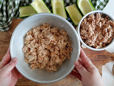 Strizza molto bene il pane ammollato e trasferiscilo in una ciotola capiente, quindi aggiungi il tonno ben sgocciolato, 3 cucchiai di polpa di zucchine, i capperi sotto aceto, il pecorino grattugiato, un pizzico di sale fino e lo spicchio d’aglio spremuto (oppure tagliato finissimo).