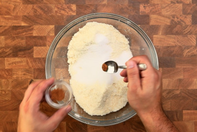 In una ciotola a mia versa il burro tagliato a cubetti e la farina. Impastali insieme e ottieni un primo impasto sbriciolato sfregando la farina tra le mani.