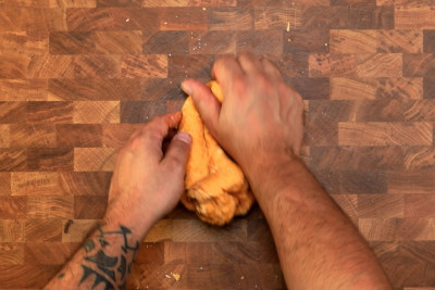 Riprendi l’impasto, dividilo in sezioni facili da impastare, e impasta ogni pezzo brevemente per fargli riacquistare plasticità. Uniscili e ottieni un unica palla di impasto.