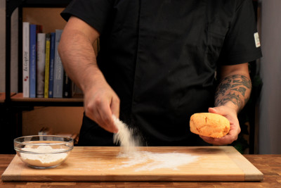 Aggiungi la zucca ormai raffreddata, l’uovo e comincia a impastare, prima con un cucchiaio di legno, poi con le mani.