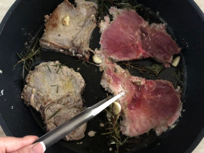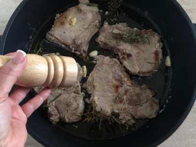 Scalda una padella capiente, versa un filo d’olio extravergine d’oliva e un pezzo di burro sul fondo. Una volta che la padella risulta ben calda, sistema le braciole con aglio e aromi nel mix di olio e burro.