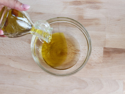 In una ciotolina metti l’aceto e l’olio, un pizzico di sale e di pepe.