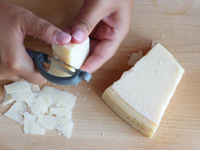 Fai le scaglie di Grana Padano con l’apposito attrezzo oppure con un pelapatate.