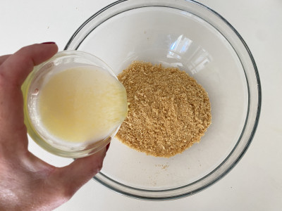 Fondi il burro in un pentolino o al microonde e versalo sui biscotti, poi mescola per bene e versa nella teglia.
