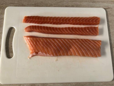 Prendi il filetto di salmone, meglio se già privo della pelle, (puoi chiedere al tuo pescivendolo di fiducia di farlo al posto tuo), controlla che sia totalmente privo di spine e taglialo per ottenere dei bastoncini da 50 g, lunghi più o meno come l’alga.
