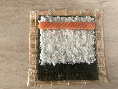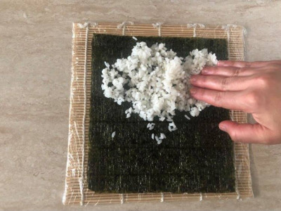 Prepara una ciotola con acqua fredda e aggiungi a questa qualche goccia di aceto di riso, ti servirà per bagnare le mani e per bagnare la lama del coltello. Lava l’avocado, sbuccialo e tagliane tre fette circa per roll: taglialo all'ultimo minuto per evitare che annersca. Ricopri la stuoia per il sushi con pellicola trasparente e poggia l’alga sulla stuoia, mettendo la parte più lucida sul fondo. Bagna le mani e ricopri più o meno ¾ dell’alga con il riso (150 g circa), livellalo bene con le mani bagnate.