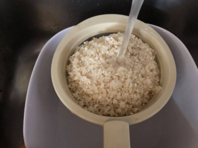 Per prima cosa dovrai preparare il riso: versalo in un colino che poi poggerai in una ciotola, lavalo accuratamente sotto l’acqua corrente, sfregando leggermente i chicchi di riso fra le mani e passandolo ancora sotto l’acqua. Procedi in questo modo, continuando a cambiare l’acqua, fino a quando questa non sarà perfettamente limpida.