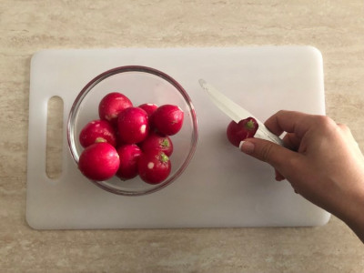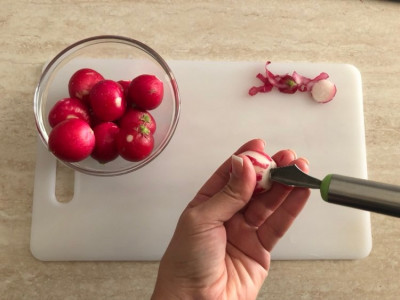 Lava accuratamente i ravanelli e rimuovi il ciuffo verde se presente. Taglia le due estremità: una estremità verrà scavata, l’altra servirà per far stare fermi gli occhi se vorrai sistemarli su un piatto. Rimuovi parte della buccia con un coltello affilato, lascia alcune parti rosse: questee saranno le striature necessarie per creare i vasi sanguigni degli occhi.