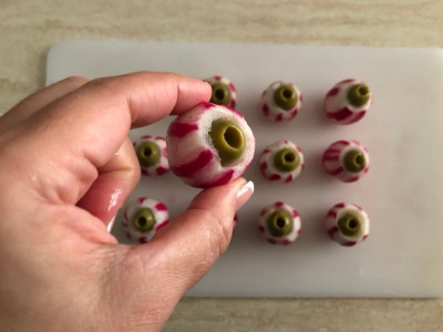 Gli occhi di strega sono pronti, sistemali in un piatto o in una ciotola, con dell’insalata fresca, possibilmente di un verde acceso in modo che risaltino meglio. Se hai anche un teschio da mettere vicino nella tua tavola imbandita a tema, faranno ancora più figura.