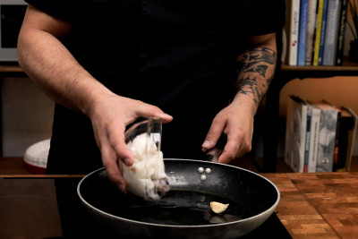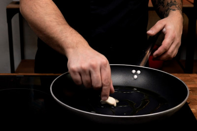 Nella padella di prima, sempre con un filo d’olio e uno spicchio d’aglio, fai rosolare seppie e calamari per qualche minuto. Condendoli con sale e pepe.