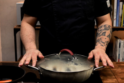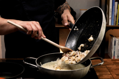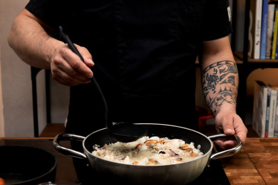 Aspetta un paio di minuti poi aggiusta la consistenza con un mestolo di brodo e manteca con un filo d’olio a crudo. Poi impiatta.