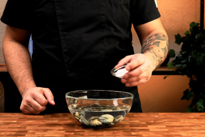 Per preparare il risotto alla pescatoria in bianco metti le vongole in una ciotola con acqua fredda con il sale, e lasciale spurgare per almeno 1 ora.